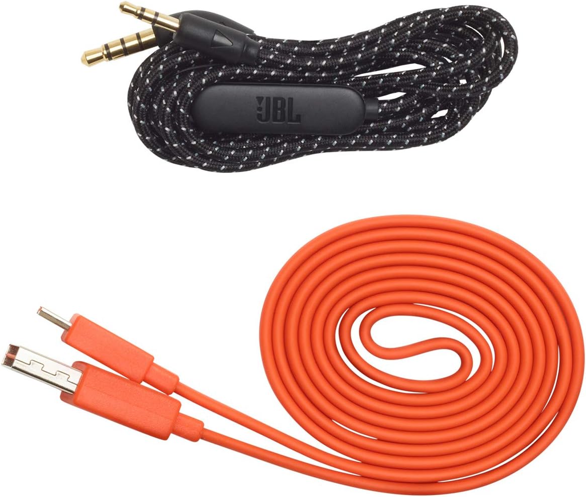 Image: JBL LIVE 400BT headphones shown with the included charging cable and 3.5mm aux cable.